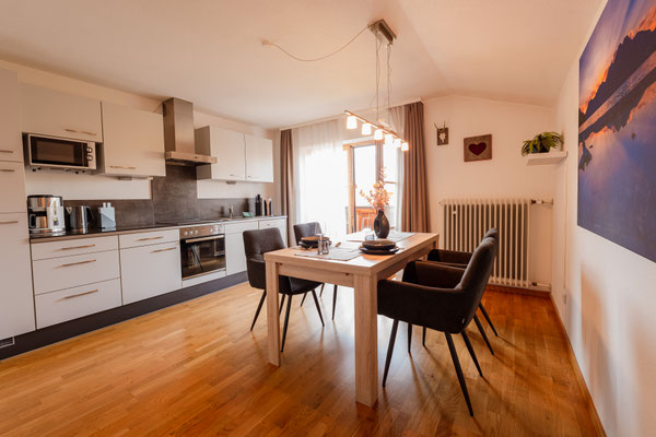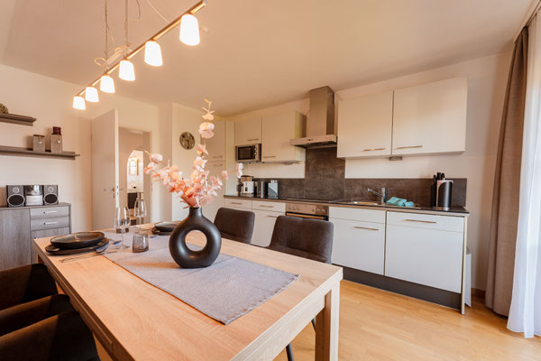 Die Küche ist ausgestattet mit einer Spülmaschine, Cerankochfeld, Mikrowelle, Wasserkocher, PAD-Kaffeemaschine und einem Backofen